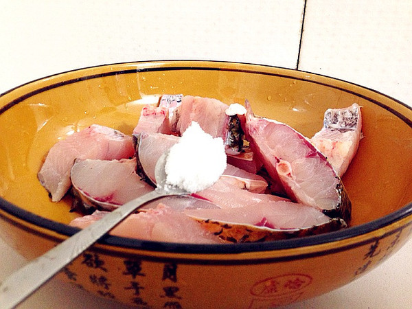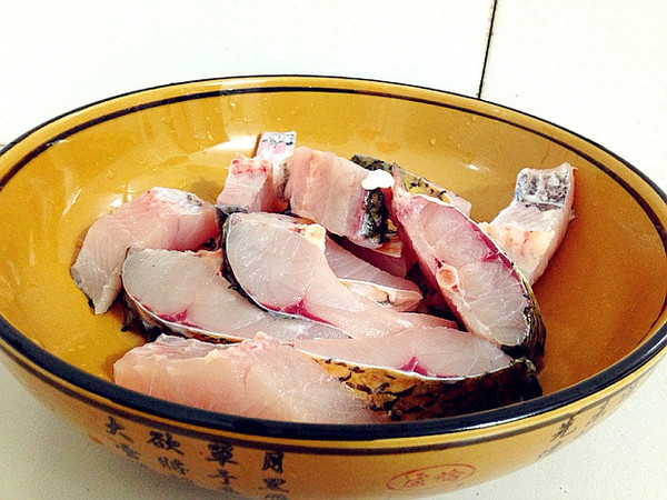 处理干净的鱼切下鱼头,将鱼身斩成段,在改切成块