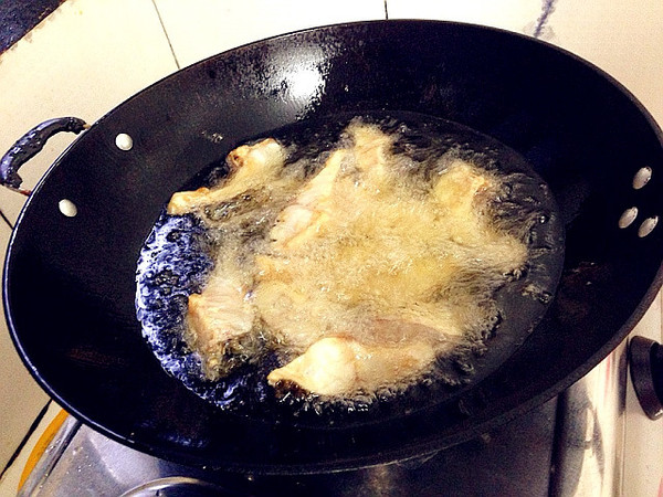 热锅注油,烧制五成热,放入鱼块,搅匀,炸约两分钟至熟