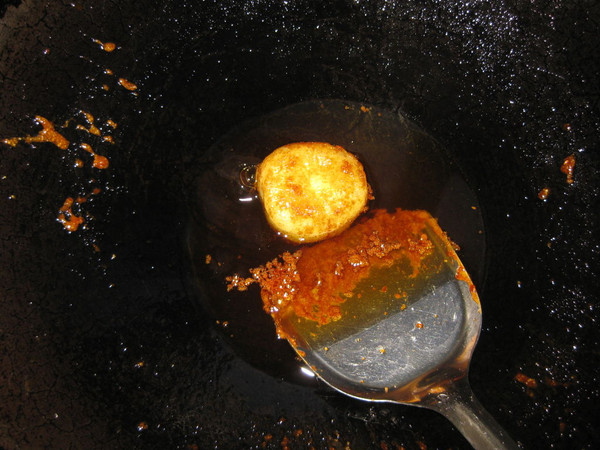 关键步骤。锅入菜油,入红糖碎。油多一点操作容易一些。升高油温到5成左右,为防粘连要隔段时间依次放入粉团,看到粉团周围开始有节律的冒泡就合适了。把火稍微关小一些,等一会儿,此间不要碰触粉团。等粉团表面稳定就可轻轻搅动他们了。继续等到粉团膨胀,慢慢把火力加大,将红糖熬化。短时间大火快速翻动将粉团炸定形和均匀裹上红糖,关火。