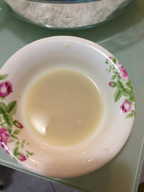 酵母用温水化开。酵母的用量按照酵母袋上的说明使用。我用的高活性酵母,按用量表只需两克即可。