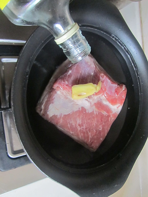 将正正方方的肥瘦相间的五花肉块放入冷水中,加入2-3片姜片和适量白酒;