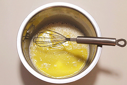 加入蛋黄、盐搅拌匀均。加入黄油搅拌匀均。