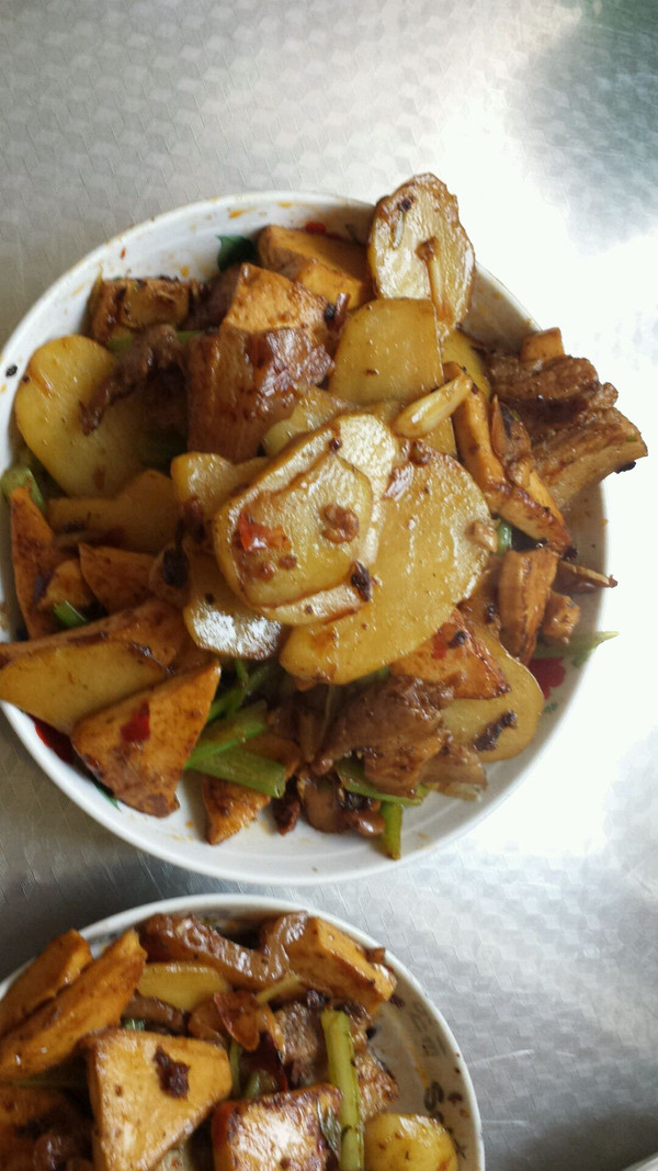放入豆腐和土豆,放耗油,酱油翻炒。最后放入芹菜