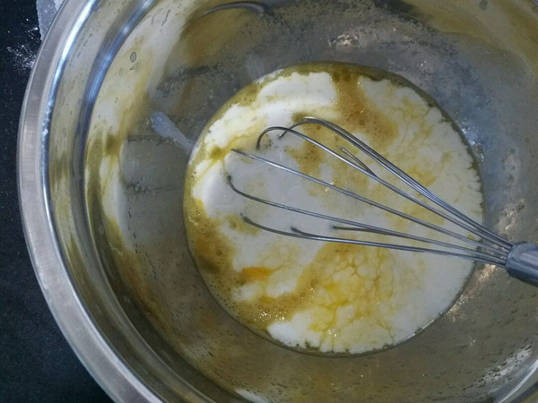将面粉糊倒入鸡蛋牛奶液中,拌匀