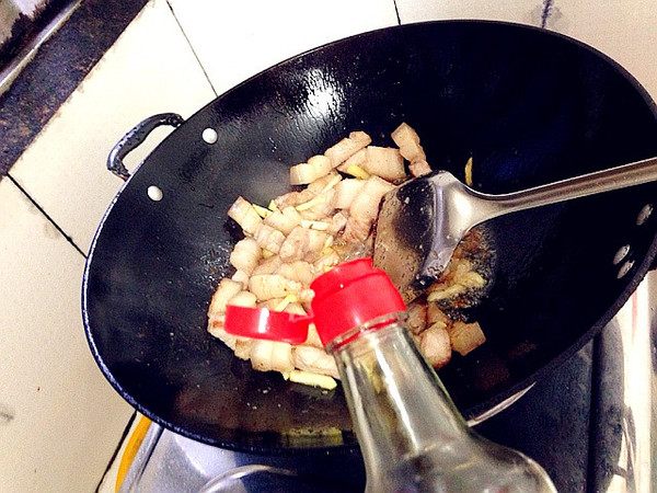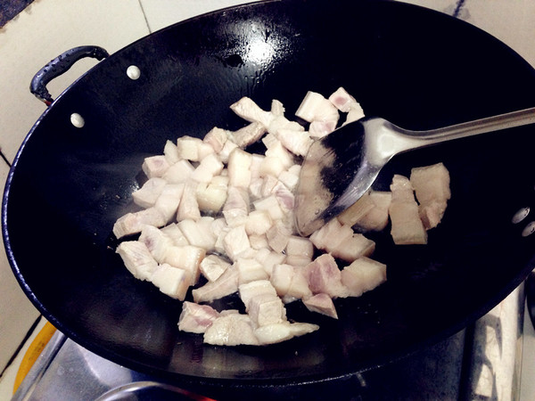 用油起锅,倒入五花肉,翻炒至转色和出油