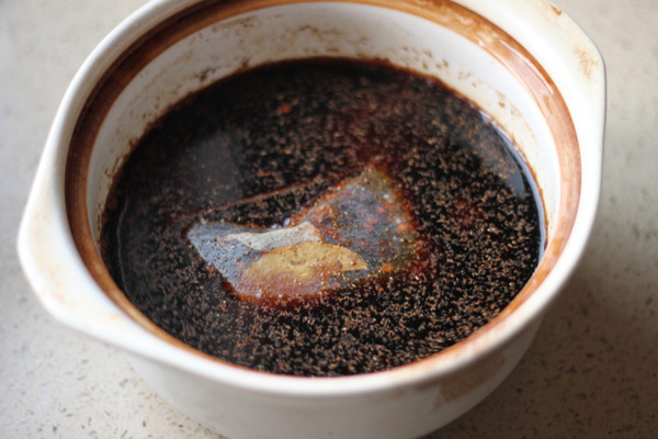 另取一口锅,倒入适量生抽及老抽,放入卤料包、少许辣椒粉及冰糖;