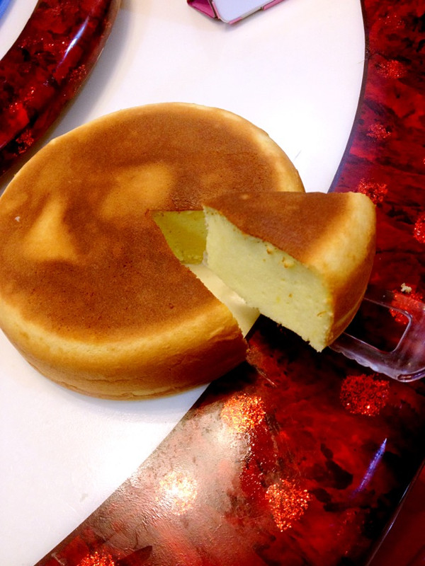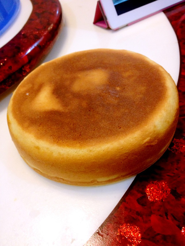 烤好的蛋糕无需倒扣,上面是淡色的,冷却后自己会缩小一点点,自动与胆壁脱离,这时候倒扣到盘子里,可以吃了,着壁部分都是金黄色,比烤箱的要更香嫩