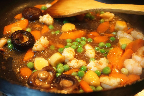 用蚝油、生抽、糖、盐,还有刚才的适量香菇水,调成一碗调料汁。热锅后加入少许油,放入胡萝卜和香菇翻炒。