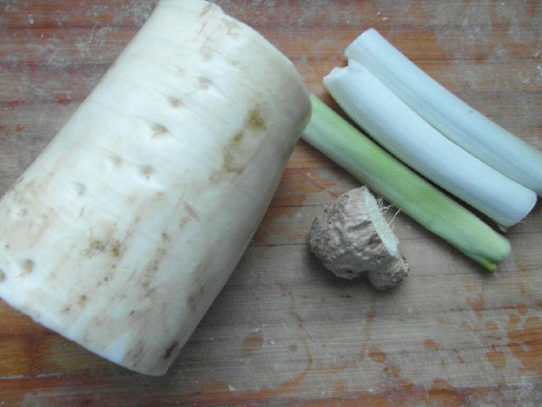 葱、姜切末,放入萝卜丝中,加十三香、胡椒粉,少许蚝油(没有可以不加)。