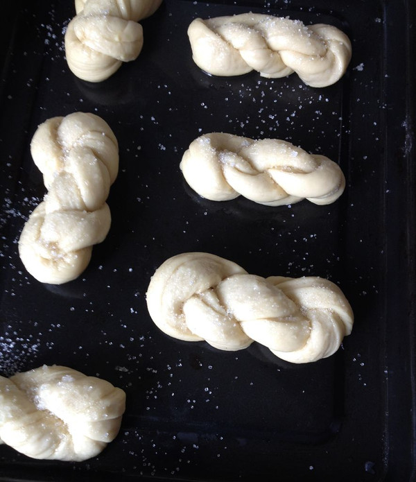 醒发至原来的一倍大,刷上色拉油,沾上细纱糖,放入预热好的烤箱中层200度,烘烤16-20分钟。