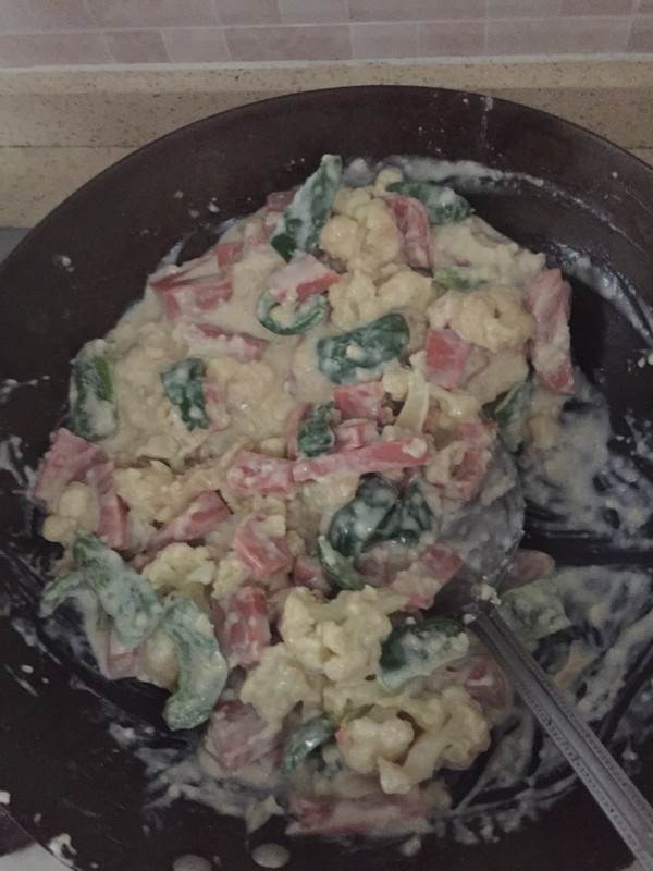 然后把配菜放到锅中和白汁一起炒均,这个步骤要试味,盐糖味精等按自己的重淡口味加上,自己觉得够咸就ok了