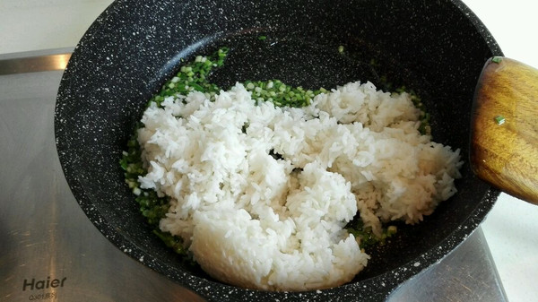 再倒入1碗冷饭翻炒,一直炒到颗粒分明为止。