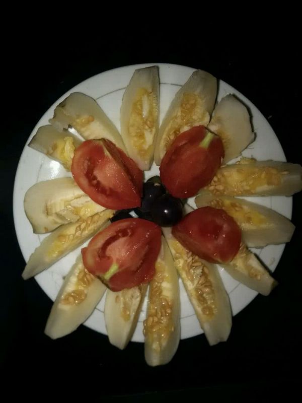 甜瓜、西红柿洗净切成块,葡萄摆在正中间,西红柿摆在葡萄周围,甜瓜摆在盘子最外围,浇上酸奶入冰箱冷藏一小时,取出开始享用吧!