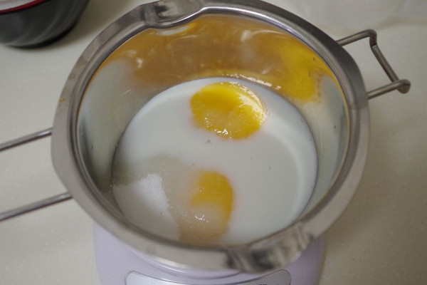 趁热将小块的巧克力倒入,不断搅拌至巧克力溶化。