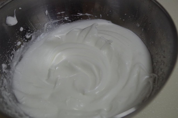 先打发蛋清,将细砂糖分三次加入蛋清,用电动打蛋器进行打发,打至湿性发泡,即提起打蛋器可以拉出尖角,并且尖角向下垂下。如果尖角直立则为干性发泡,在做戚风蛋糕时,蛋白需要打发到这种程度。