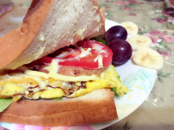夹生菜 鸡蛋 火腿 西红柿 挤上沙拉 切片面包合上 大功告成