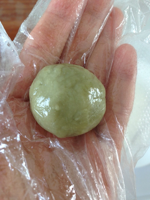 取一小块面团,压平放入豆沙馅,随后包起来收口,再轻轻揉成球形。