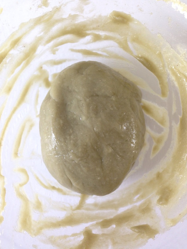戴一次性手套,手套上抹点油,将蒸好的面糊揉成面团。