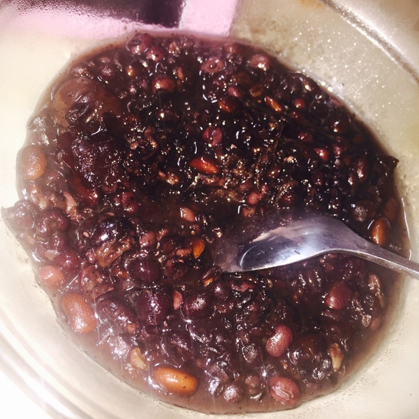 把黑豆,红豆,薏仁,黑米泡入水中一宿。