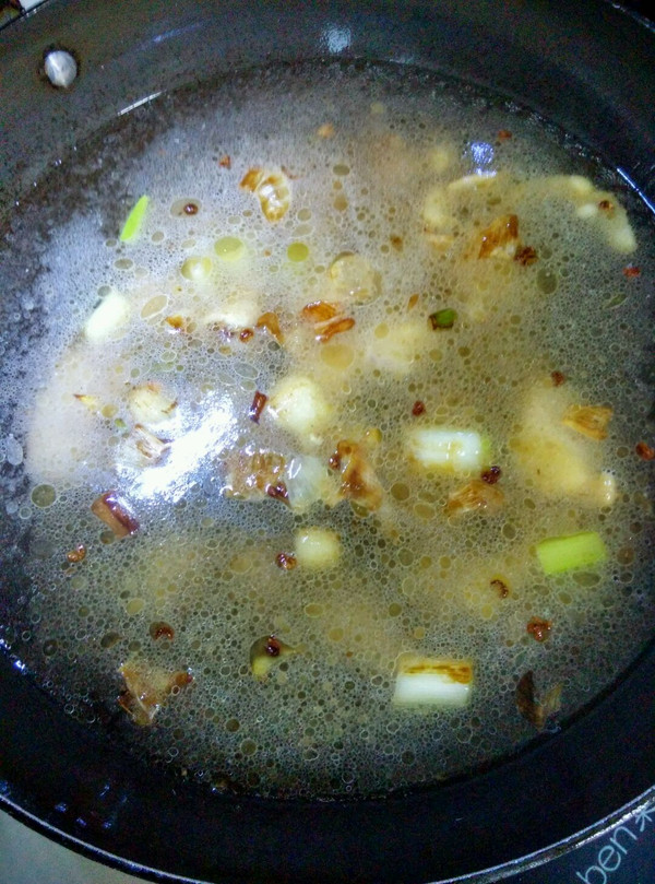 锅里倒油,放入几粒花椒,葱段和姜片炒香。