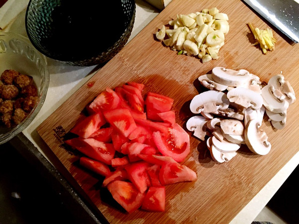 番茄切丁,口蘑切片,黑木耳用冷水发好,小肉丸是上次油炸好冷冻的存货。蒜切碎,姜切丝。