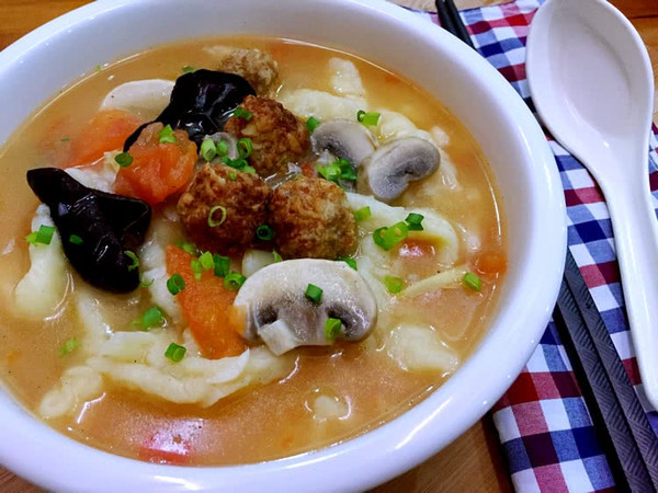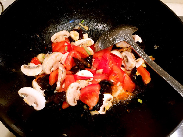 起锅放油,蒜姜稍煸,放入番茄口蘑木耳翻炒。放少许盐可促使番茄快速出汁,加水。大火水开转中火,用一只木筷沿碗边抹面糊成条状入锅,适时用勺子搅动不让面疙瘩粘锅。