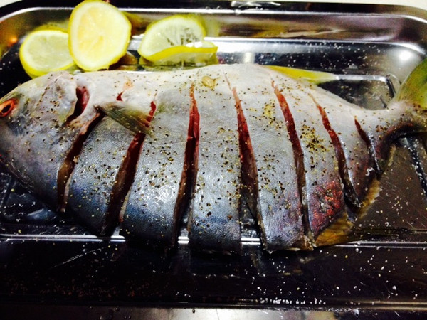 一.金昌鱼洗净吸干水分,里外挤入少许柠檬汁,再里外撒入盐、胡椒粉、抹匀,腌制10分钟!二.从背部切段,方便食用;肚子不要切断,否则不易煎制,会倒下、不方便煎鱼皮!