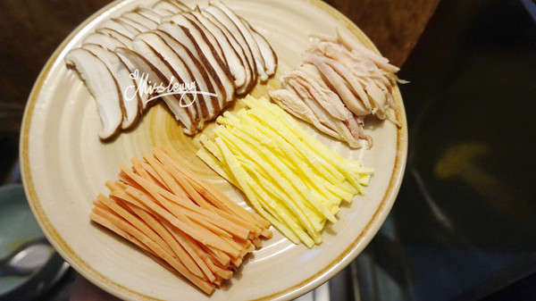 香菇、牛肉肠、一部分蛋皮切丝备用~香菇切好要焯熟~鸡腿肉煮熟撕成丝备用~(建议用鸡胸肉~可以成功的撕成丝~传统的配料还有鱿鱼丝和蟹棒~都切成丝备用~鱿鱼丝要焯好水~我这是自己吃就这几种就行了。。。事实证明就这一点都还没用完。。。)