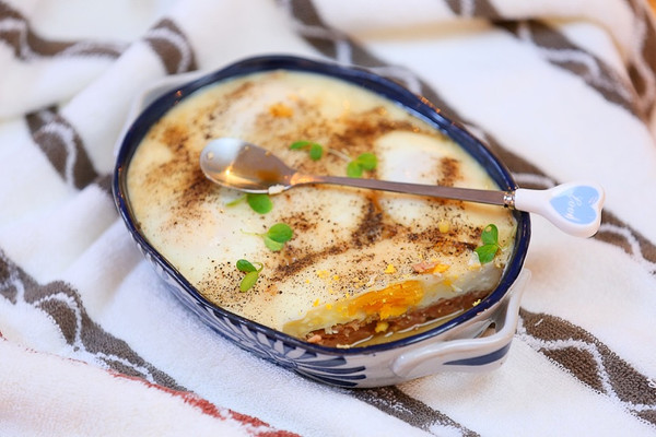 在铺好的肉馅上打入鸡蛋,表面撒少许黑胡椒粉