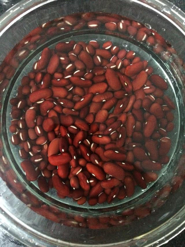 红豆用水洗净.温水泡两个小时以上.如果不急泡一晚上也可以