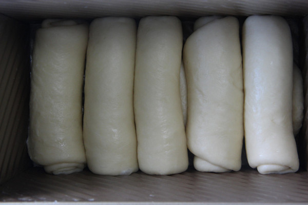土司模具内壁扫上一层黄油,卷好的面卷排好放入土司盒,送入烤箱设置“发酵”功能进行二次发酵,表面洒点水