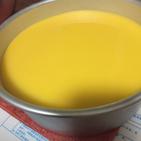 2小时后拿出蛋糕模具,倒入芒果胶放入冰箱冷藏一晚