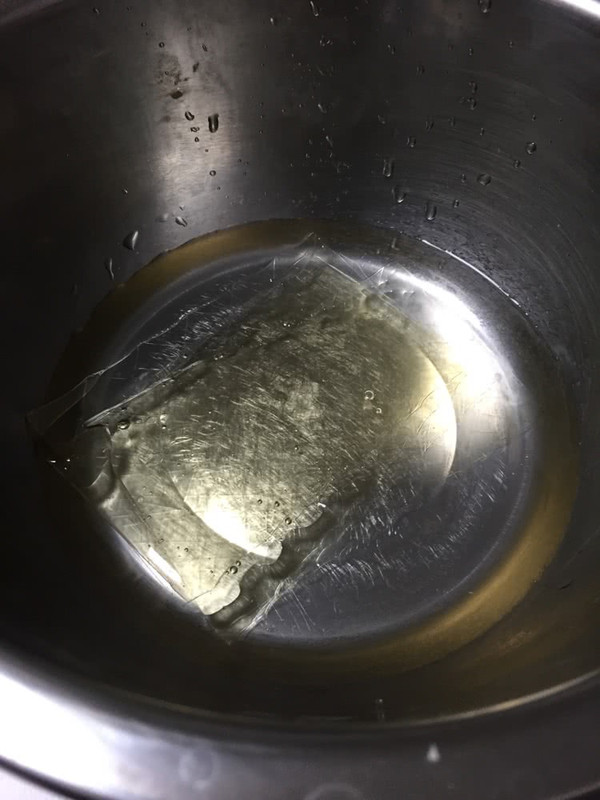 最后一片吉利丁片软化后放入60g热水融化后放入剩下的50g芒果泥搅拌均匀