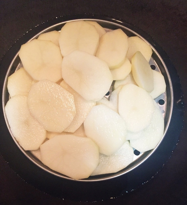 土豆去皮切片,直接隔水蒸。蒸至筷子能戳烂为止,取出稍微凉一下。