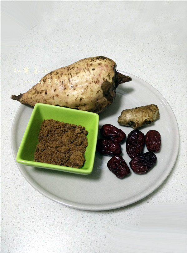 红薯洗净,去皮,切成方块;老姜洗净,削掉老姜皮,切片处理;