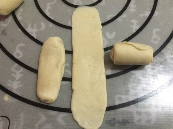 松弛好的面皮按扁,擀长卷起,盖上保鲜膜再松弛二十分钟。
