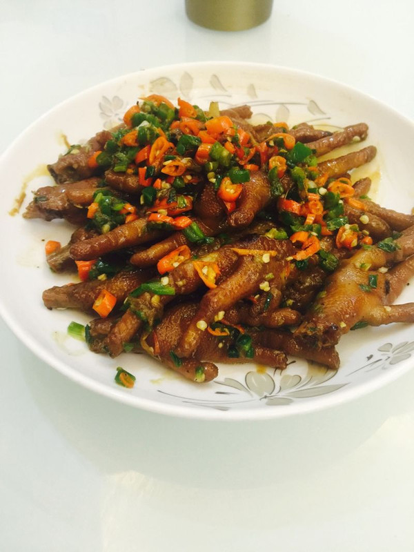 炒锅放入辣椒,葱花,可以把鸡爪放进去稍微翻炒下就可以出锅了。