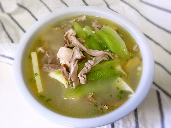 猪肚先不要切条,直接整个和鸡放入锅中煲,锅里只需放小葱节、姜片,以前我爸妈做这道菜是直接将整鸡塞入猪肚里去慢炖,炖好上桌前再将猪肚切条