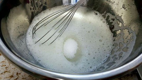 下面开始打蛋清!并分三次放入刚才的白砂糖,第一次,蛋清打到有鱼眼泡,倒入一次白糖!