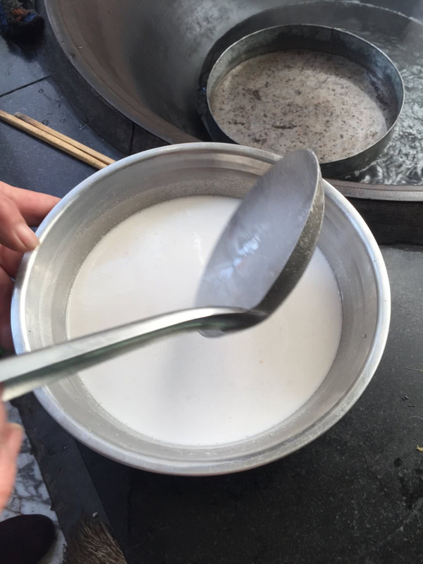 粉扇上倒进少许油,把搅好的淀粉放进去,能把盘底摊平。直到淀粉凝固不在流动。