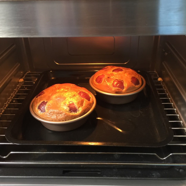倒入不沾模具,我用的是阳晨的汉堡模,如果不是不沾的模具,要提前抹层黄油防粘,倒8分满,放入洗净的樱桃