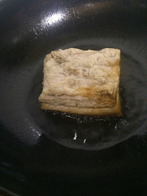 起油锅,油温八成热时放入五花肉,肉皮朝下,开小火把肉皮那面煎至金黄,煎之前检查下肉块,要擦干水份,要不然放到锅里会爆油,身上脸上溅到了可不好玩哦。