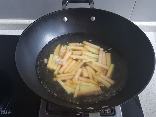 红薯去皮切条,锅内烧开水,放入红薯煮至稍软(红薯不要完全煮熟,后期还要翻炒,太熟就烂了)