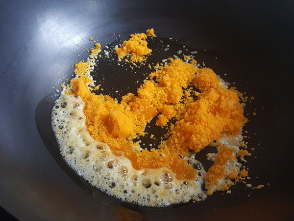 锅内倒少许植物油,中小火,倒入咸蛋黄末翻炒(如果你的咸蛋黄不太咸,这一步可以放少许盐。)