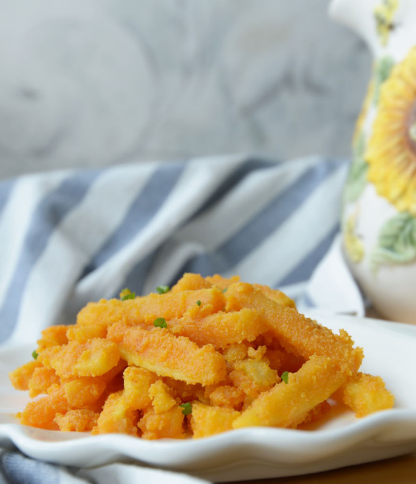 倒入红薯条翻炒,让咸蛋黄末均匀地裹在红薯上