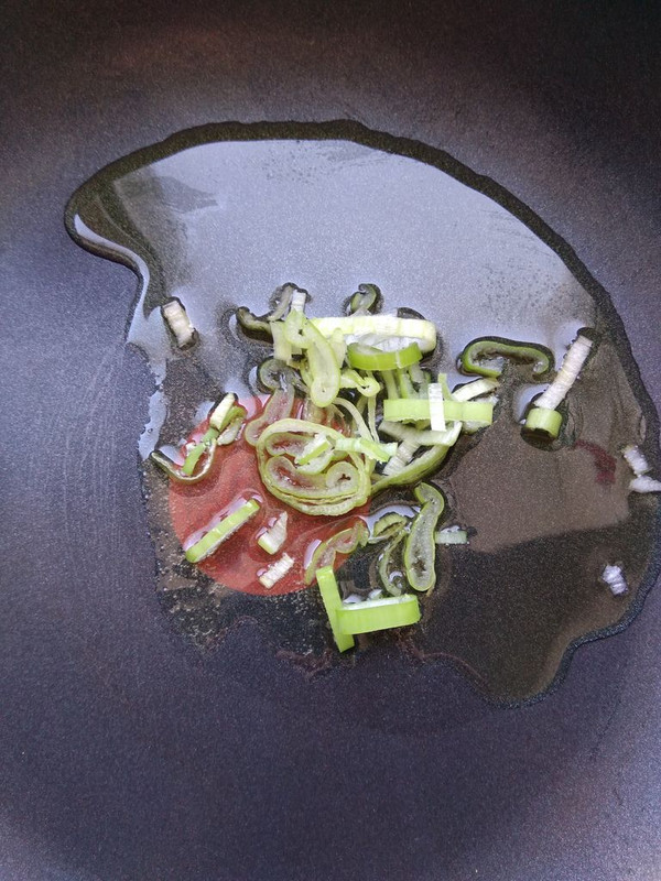 热锅热油,爆香葱花。用葱花或蒜片都可以。