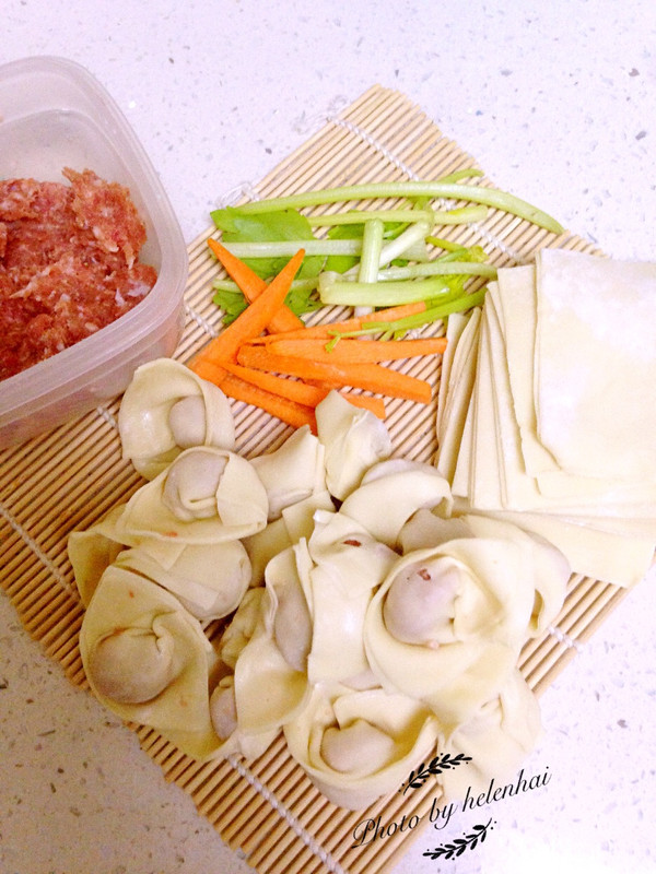 我家姐弟俩最喜欢吃的用铁脯粉、胡椒粉、鸡精、盐拌匀的肉末做成馅的简单馄饨饺子。