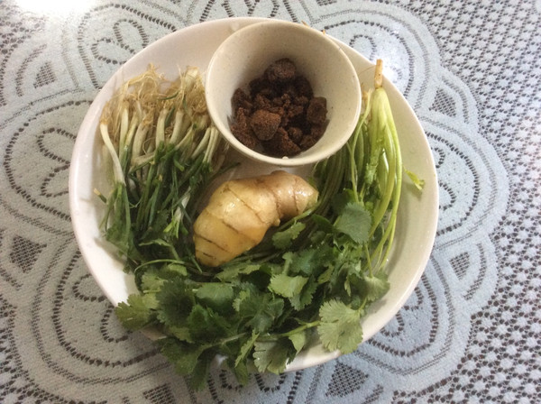 将洗净的葱,香菜,姜(切片)加水煮5-10钟左右,取出葱,姜,香菜留汤汁加入红糖煮开,起锅。