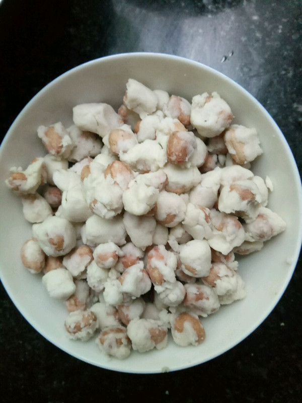 蛋清倒在碗里,放糖,搅拌至糖融化。(我用的半碗花生,所以只用了蛋清)。