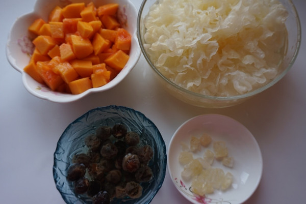 银耳提前泡发,泡2—3小时为宜,不用泡太久。木瓜半个去皮切成方块。干桂圆泡15分钟便可。冰糖自定。